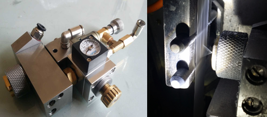 煙草行業(yè)各廠在用的濾棒成型機(jī)或進(jìn)口自德國(guó)HAUNI(虹霓)公司(KDF2,KDF3, KDF4等)或由國(guó)內(nèi)經(jīng)技術(shù)轉(zhuǎn)讓生產(chǎn),各機(jī)型的成型紙上膠裝置均采用接觸式涂膠筆,濾嘴棒加工過程中涂膠筆由氣缸推動(dòng)頂在成型紙上施涂,涂膠頭會(huì)存在一定壓力作用于成型紙上。隨著濾棒加工工藝的改進(jìn),高透氣性成型紙大量投入濾棒的生產(chǎn),目前卷煙企業(yè)大量使用的濾棒成型紙透氣度是6000CU,部分高達(dá)10000-27000CU。這個(gè)時(shí)候成型機(jī)中線膠涂膠系統(tǒng)使用的粘合劑,因接觸式施涂一方面涂膠頭部位大量積膠,另一方面膠液能夠輕易的從由成型紙上膠面滲透到成型紙非上膠面,所滲膠水隨成型紙運(yùn)行涂抹在成型機(jī)相關(guān)的部位,很快就積聚成了具有危害性的積膠污垢從而帶來(lái)了許多問題,使濾棒成型機(jī)和濾棒發(fā)射機(jī)的相關(guān)部件產(chǎn)生大量積膠,對(duì)濾棒生產(chǎn)及生產(chǎn)現(xiàn)場(chǎng)管理也會(huì)造成影響。